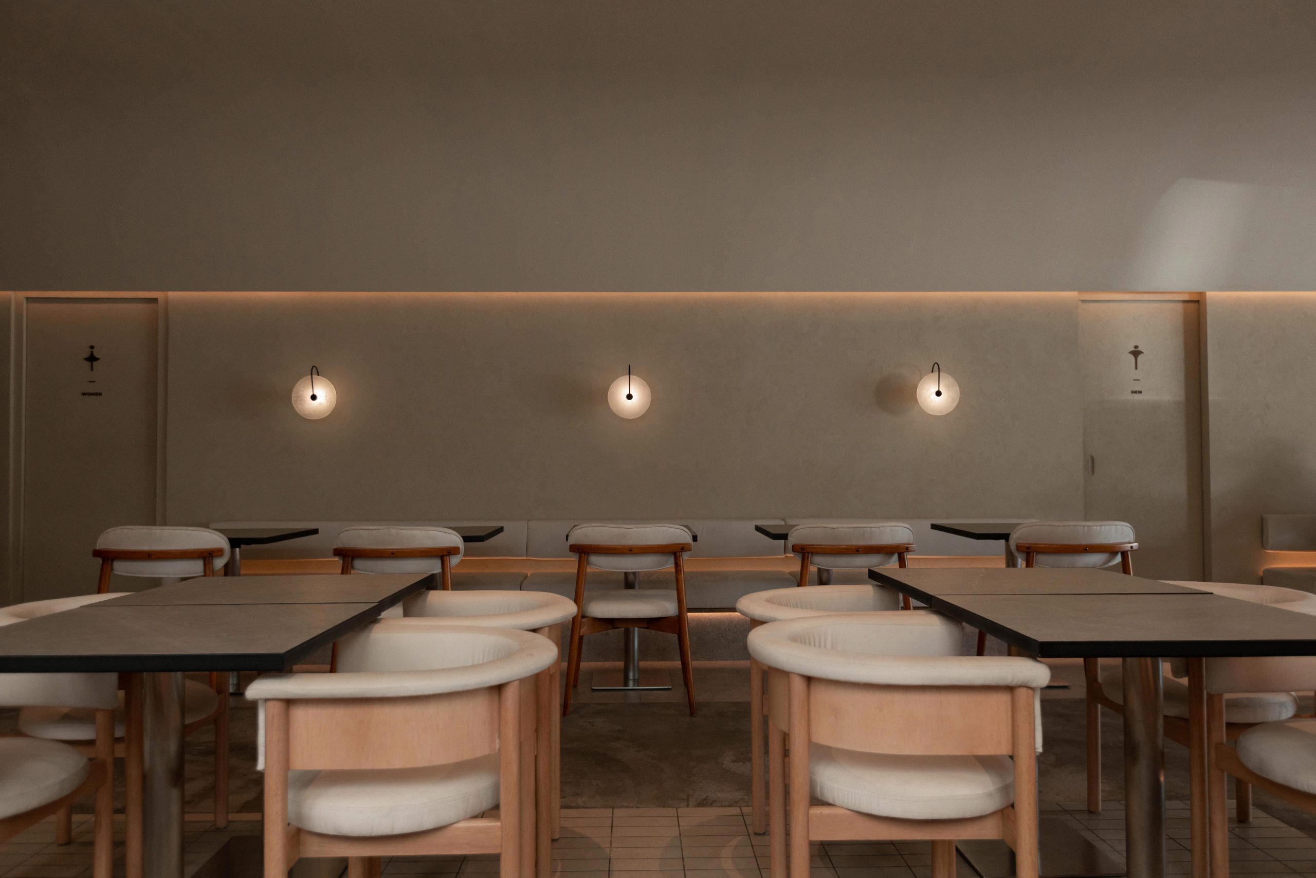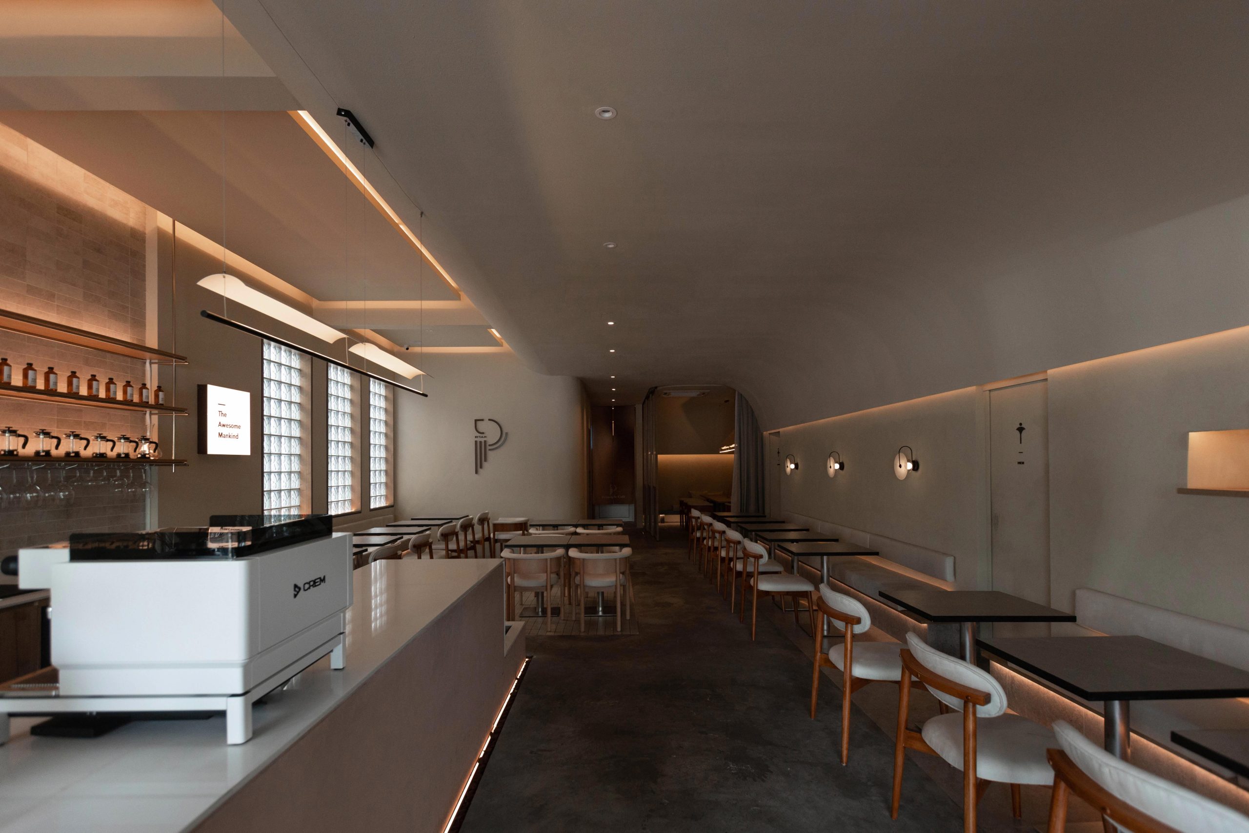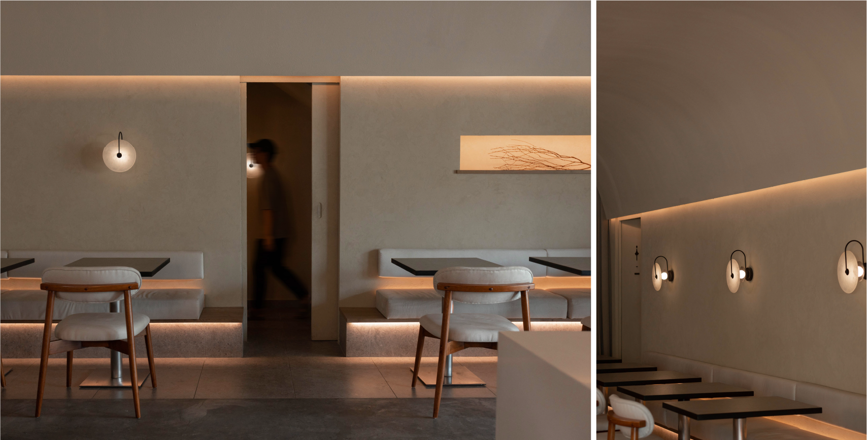 通过几何图形与光影的相互交错,使得墙体表面的自然肌理纹路更加微妙。流畅的弧线在空间里无限延伸,柔化了空间的棱角,也使直线与曲线相互依存,营造出独特的空间观感。